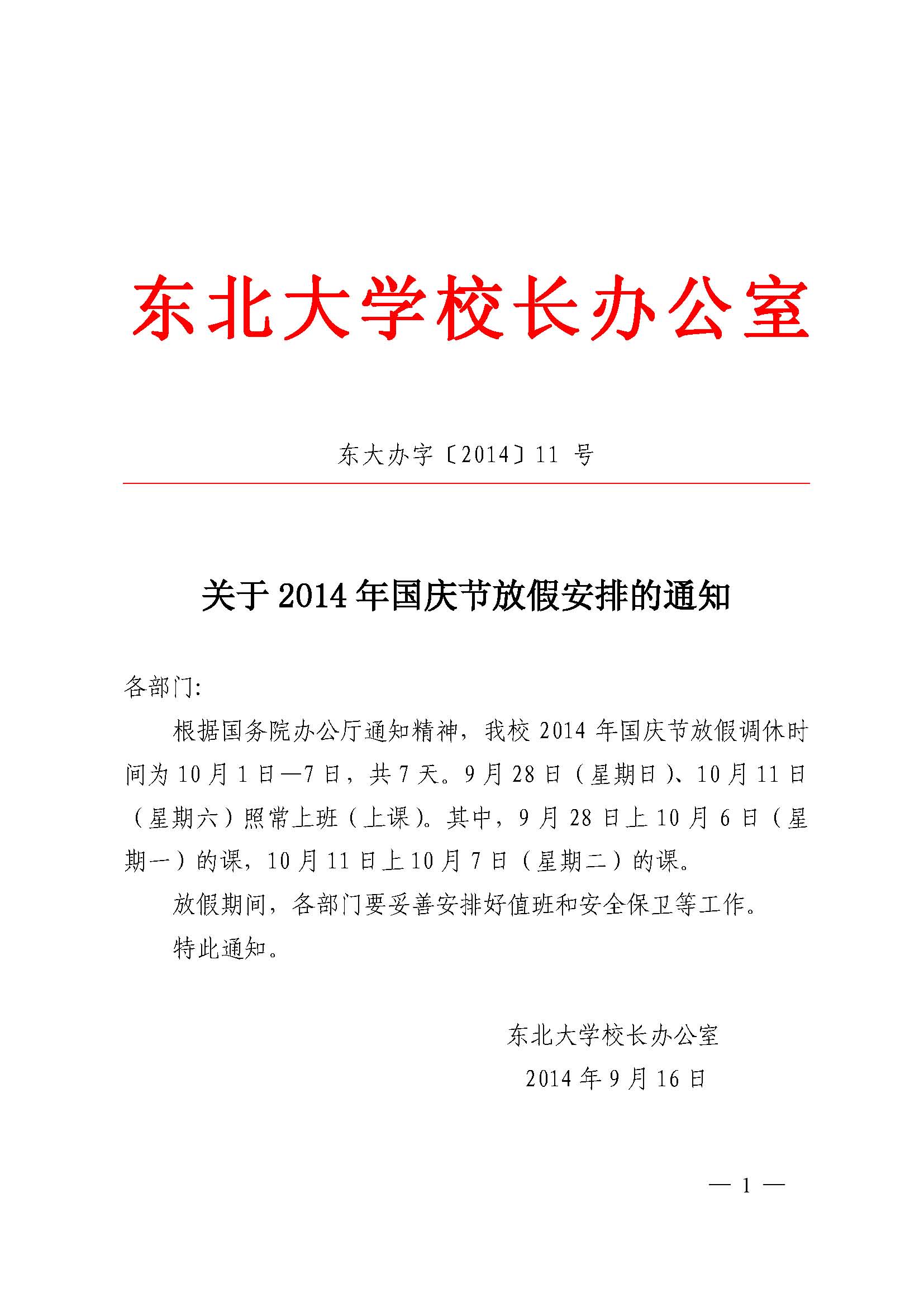 转发《关于2014年国庆节放假安排的通知》