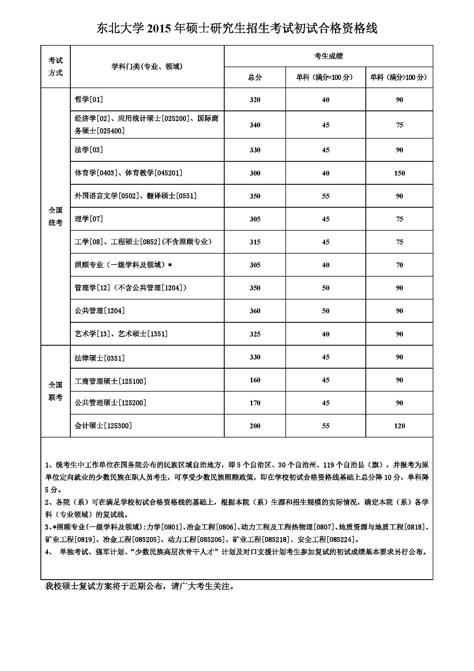 东北大学2015年硕士研究生招生考试初试合格资格线