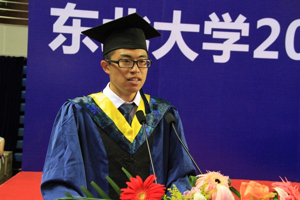 机械工程与自动化学院机械工程专业硕士毕业生张旭代表全体毕业生发言,表达了对研究生生活的怀念、对母校的眷恋以及即将扬帆起航的壮志豪情,表示要自立、自强、自信、自豪,做永远的东大人。