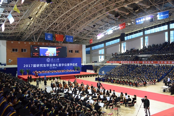 1月4日下午,东北大学2017届研究生毕业典礼暨学位授予仪式在刘长春体育馆举行。美国亚利桑那中心学院院长杰克琳·艾略特、副院长戴比·福斯特莅临观礼。校领导熊晓梅、赵继、杨明、汪晋宽、王福利、张国臣、芦延华、孙雷、王建华等出席典礼。毕业典礼由研究生院院长巩恩普教授主持。