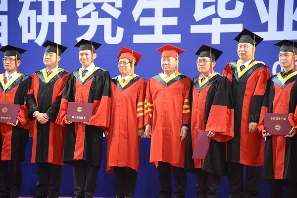 校学位委员会委员、学校领导、学院院长以及教师代表为毕业研究生颁发学位证书,为他们扶正流苏并合影留念。