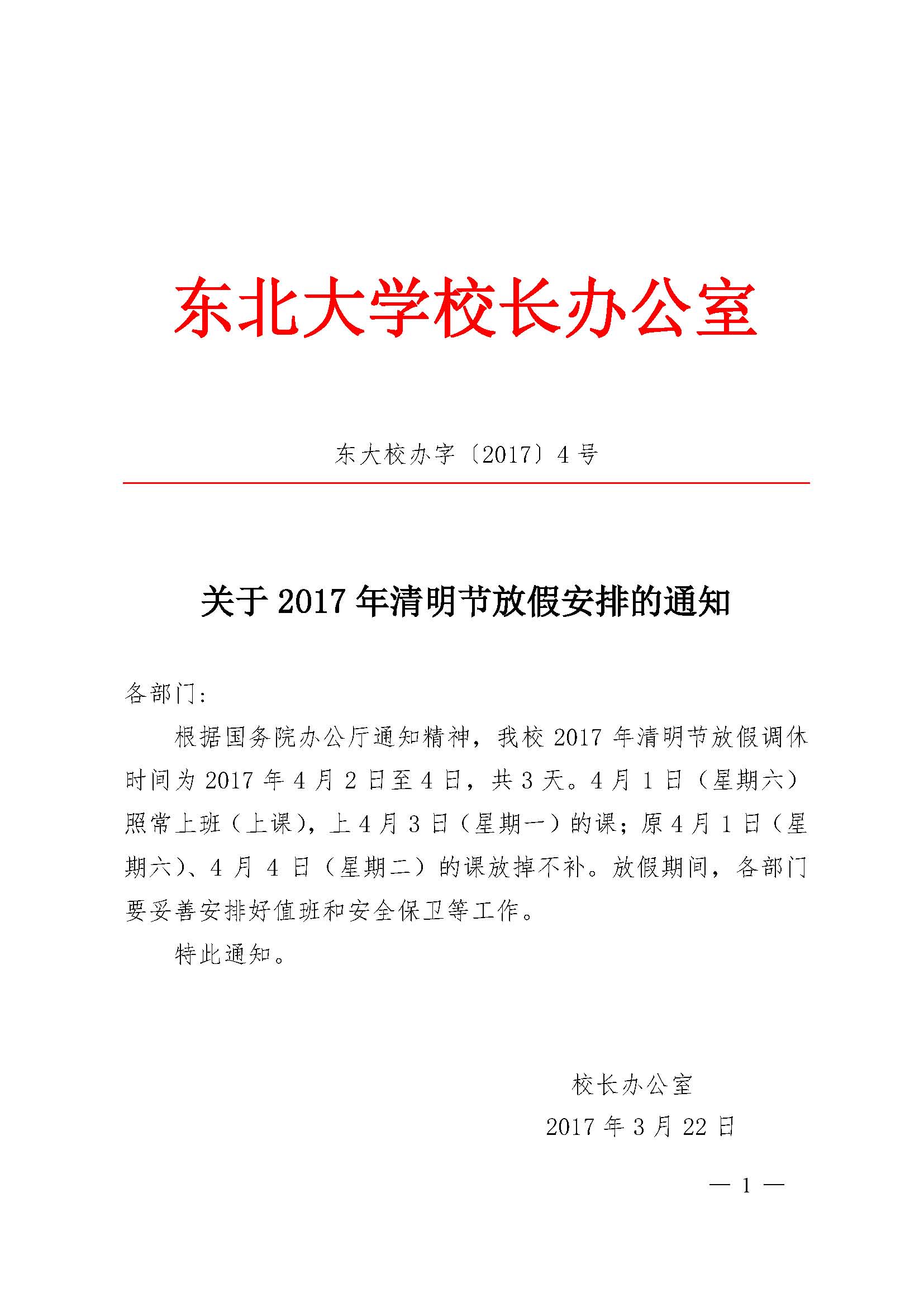 关于2017年清明节放假安排的通知