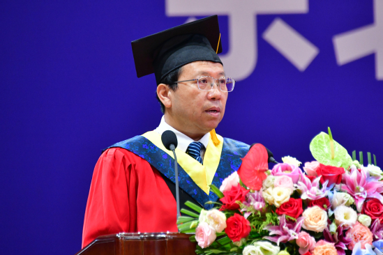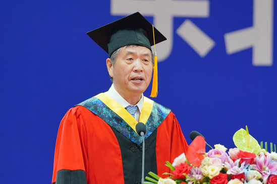 刘圆超带领全体毕业研究生宣誓,祝福父母身心同康,春晖绵长;祝福师长学术长青,桃李满疆;祝福母校硕果累累,永谱华章;祝福党和祖国繁荣昌盛,国富民强。