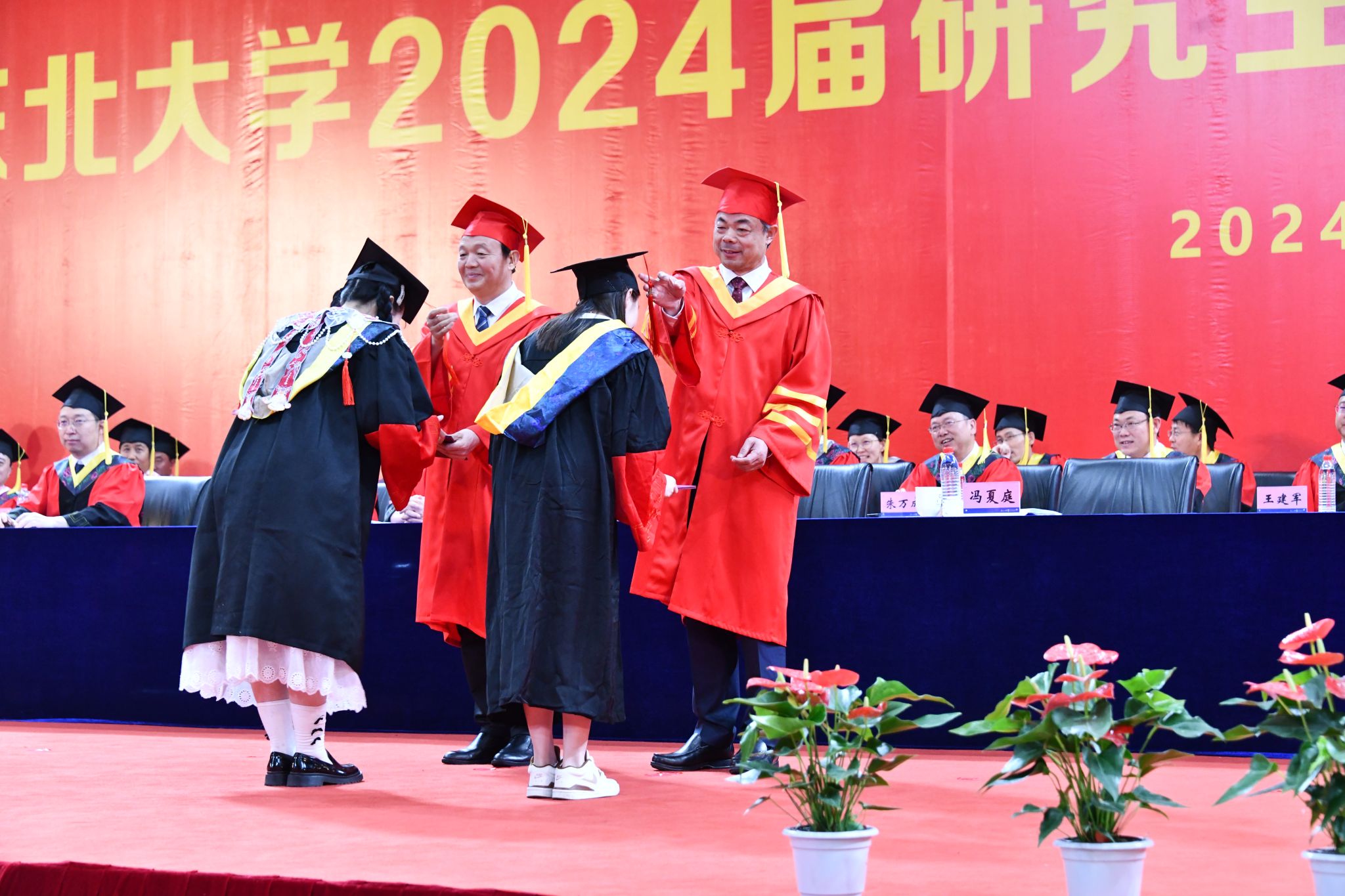 在庄严雄壮的校歌声中,东北大学2024届研究生毕业典礼暨学位授予仪式圆满结束。与会嘉宾和老师起身向在场研究生毕业生挥手送别,祝福他们毕业快乐,前程似锦,到祖国最需要的地方建功立业,以青年之力开辟新天地、创造新奇迹、书写新辉煌。